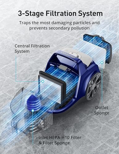 Aspiron Canister Vacuum, Upgraded 1200W Bagless Canister Vacuum Cleaner, Auto Cord Rewind, H13 HEPA Filter, 3.7Qt Large Capacity, 5 Tools for Hard Floors, Carpet, Pet, Upholstery, Tiles, Car, Blue