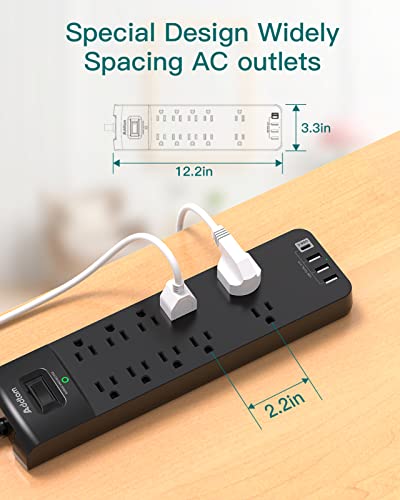 ★ Wide Spaced Outlets: 2 Special design widely spacing AC outlets with 2 inches space in between, larger than standard 1.5-inch/1.8-inch socket. Making it enough to fit big adapters. Essentials for computers, laser printers, and home-theater systems.